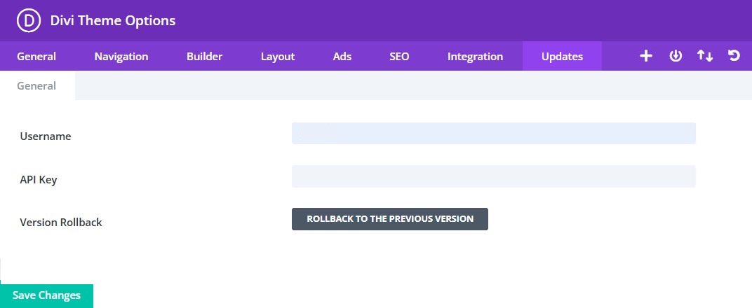 Dans l’onglet Updates, entrez le Username et le API Key. Pour terminer, cliquez sur Save Changes.